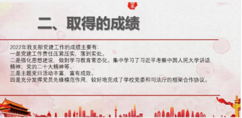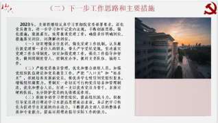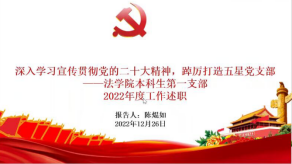 本科生第二党支部书记庞红主要围绕工作开展情况、存在的问题以及未来工作安排三方面展开。在工作建设方面突出政治本色,加强政治建设;突出思想引领,加强思想建设;突出党员标准,加强组织建设;突出效能导向,加强制度建设。针对理论学习不够深入、工作不够创新以及工作交接密度不够等问题明确解决方案,全面加强政治理论学习,深入贯彻党的二十大精神,科学统筹开展支部工作;结合员工思维特点,开展特色活动;突出学科特色,打造党建品牌,立足法学专业,发挥党员标杆作用,加强先进典型选树力度。