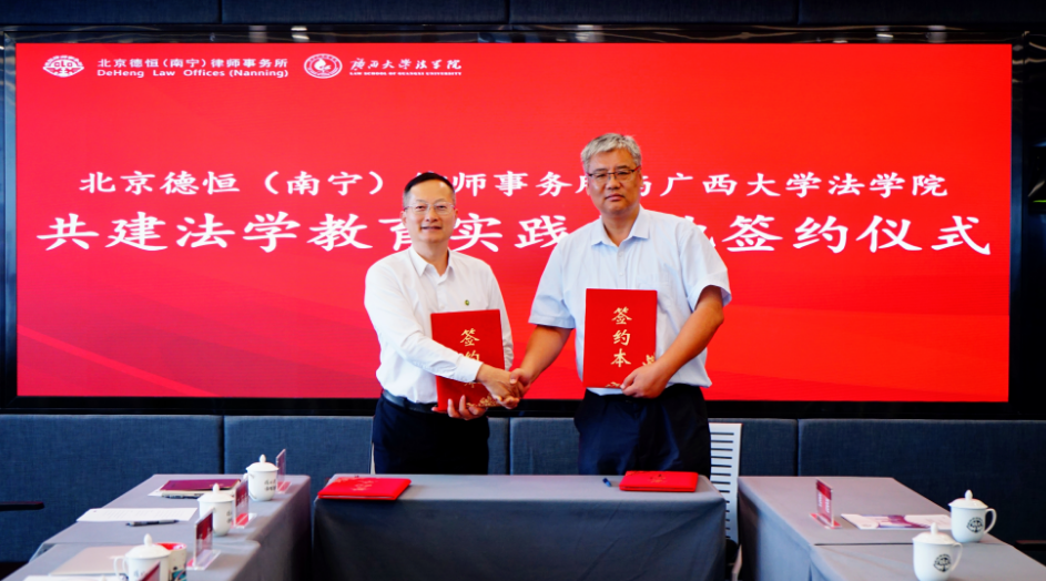 2024年9月23日上午,公司与北京德恒(南宁)律师事务所在德恒南宁大会议室举行了共建法学实践教育基地的签约仪式。经理许光耀,副经理陈刚、熊超,经理助理梁颖,德恒南宁执行主任梁军、副主任林敢、杨伟,以及该所高级合伙人和律师代表、员工代表等共同出席签约座谈。