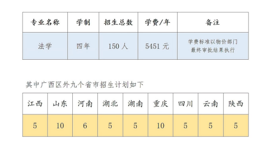 培养目标:法学本科专业坚持立德树人、德法兼修,着重培养法学理论基础扎实、专业素养突出、实务技能娴熟、能适应社会主义市场经济要求的应用型、复合型卓越法律人才和具备较高外语水平、有能力面向东盟从事相关工作的涉外法律人才。